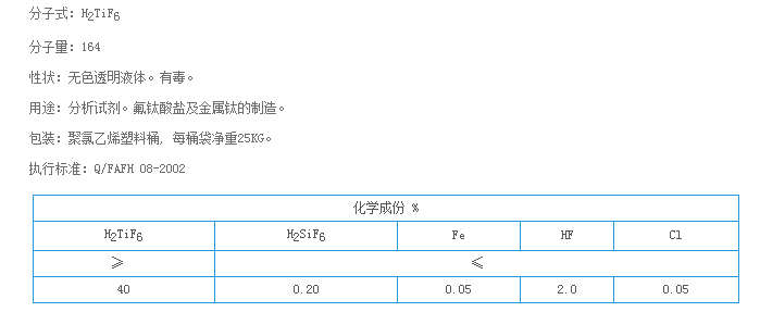 分子式:H2TiF6分子量:164性状:无色透明液体。有毒。用途:分析试剂。氟钛酸盐及金属钛的制造。...